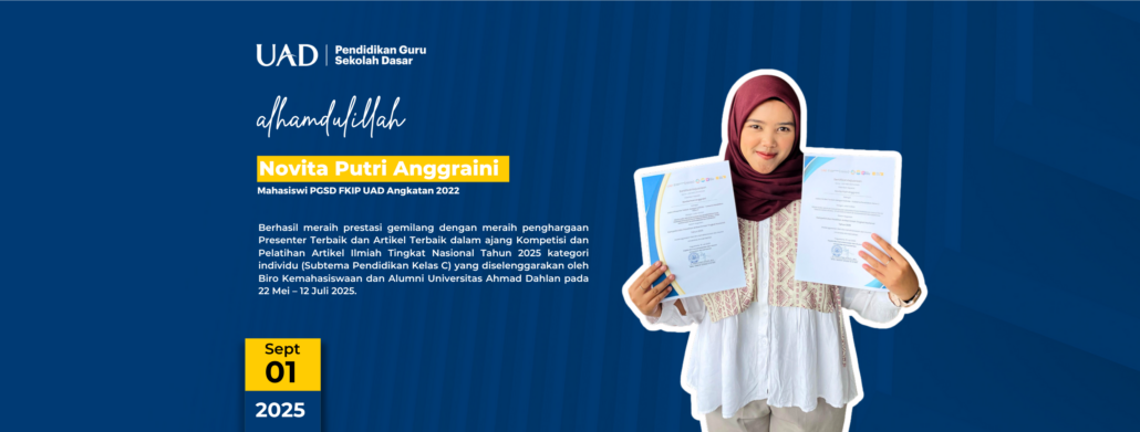 Yogyakarta (01/09/2025) Mahasiswa PGSD UAD berhasil menorehkan prestasi gemilang dengan meraih Juara 2 pada ajang Kompetisi dan Pelatihan Artikel Ilmiah Tingkat Nasional. Kemenangan istimewa ini di dapat berkat kemampuan mahasiswa memborong dua penghargaan sekaligus Presenter Terbaik dan Artikel Terbaik Individu.