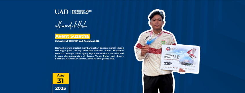 Yogyakarta (31/08/2025) –Universitas Ahmad Dahlan kembali menorehkan prestasi membanggakan pada tingkat olahraga nasional. Mahasiswa Program Studi Pendidikan Guru Sekolah Dasar sukses mengharumkan nama almamater melalui cabang olahraga dirgantara. Avent Suzetha berhasil meraih medali perunggu dalam Kejuaraan Nasional Gantolle Seri Dua Tahun 2025. Capaian tersebut memperkuat eksistensi mahasiswa FKIP UAD dalam kompetisi olahraga prestisius tingkat nasional.
