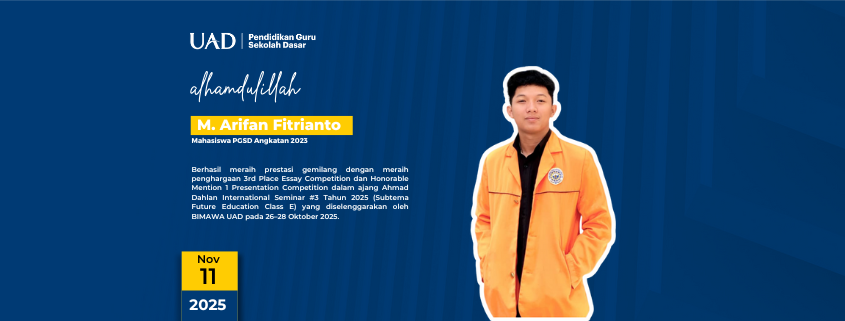 Yogyakarta (11/11/2025) – PGSD FKIP UAD kembali mencatat prestasi membanggakan pada ajang Ahmad Dahlan International Seminar #3 Tahun 2025. M. Arifan Fitrianto, mahasiswa angkatan 2023, mengharumkan nama program studi melalui kompetisi esai dan presentasi internasional. Kegiatan akademik tersebut berlangsung atas koordinasi Biro Kemahasiswaan dan Alumni Universitas Ahmad Dahlan. Oleh sebab itu, prestasi internasional kembali memperkuat reputasi PGSD FKIP UAD pada forum ilmiah global.