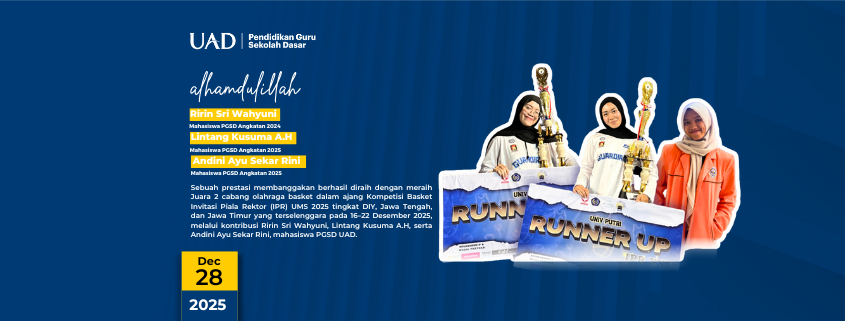 Yogyakarta (28/12/2025)-PGSD FKIP UAD kembali mencatat prestasi melalui raihan Juara 2 Kompetisi Basket Invitasi Piala Rektor UMS 2025. Capaian membanggakan tersebut mengukuhkan peran PGSD FKIP UAD sebagai penggerak prestasi mahasiswa. Semangat sportivitas terus tumbuh karena program pembinaan berjalan konsisten sepanjang semester. Prestasi tersebut juga mencerminkan budaya kompetitif yang terus terjaga pada lingkungan PGSD FKIP UAD.