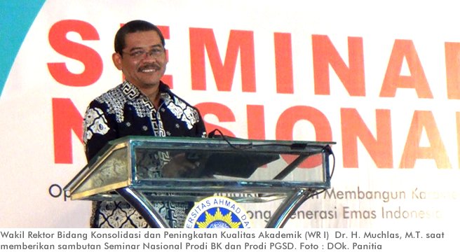 Seminar Nasional ini dijadwalkan dibuka secara langsung oleh Rektor Universitas Ahmad Dahlan, namun karena berhalangan hadir maka diwakilkan Wakil Rektor Bidang Konsolidasi dan Peningkatan Kualitas Akademik (WR I) Dr. H. Muchlas, M.T.. Dalam sambutannya disampaikan bahwa Rektor UAD memberikan apresiasi yang luarbiasa atas terselenggaranya Seminar Nasional kolaborasi Prodi BK dan Prodi PGSD dengan peserta terbanyak yakni 2000 peserta. Seminar ini merupakan seminar dengan peserta terbanyak di lingkungan UAD. Selanjutnya disampaian bahwa Negara Indonesia merupakan negara dengan mayoritas penduduk beragama Islam, dimana nilai-nilai Islami tersemai di masyarakat. Diharapkan hal ini dapat menumbuhkan kekuatan karakter yang tercermin dari umat Islam.